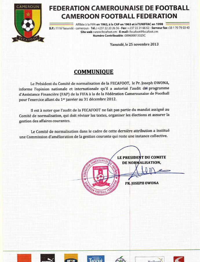 On en saura un peu plus sur le programme d’assistance financière de la FIFA à la fédération camerounaise de football pour l’exercice allant du 1er Janvier au 31 Décembre 2012. Bien que hors de sa feuille de route, le président du comité de normalisation de la Fécafoot vient d’autoriser un audit.