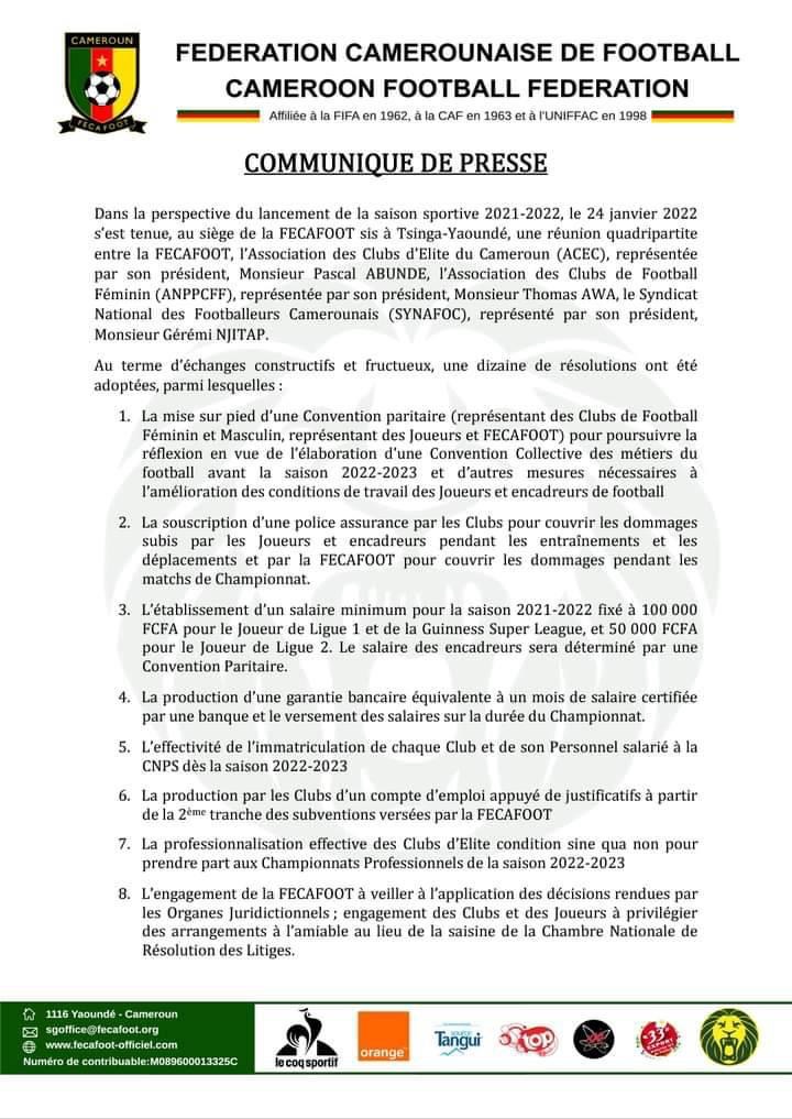 Parmi les annonces, l’on apprend que le salaire minimum des joueurs du championnat professionnel reste inchangé. Soit 50 000 francs CFA pour les joueurs de l’Elite Two et 100 000 francs CFA pour ceux de l’Elite One.