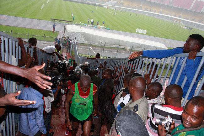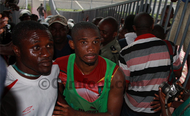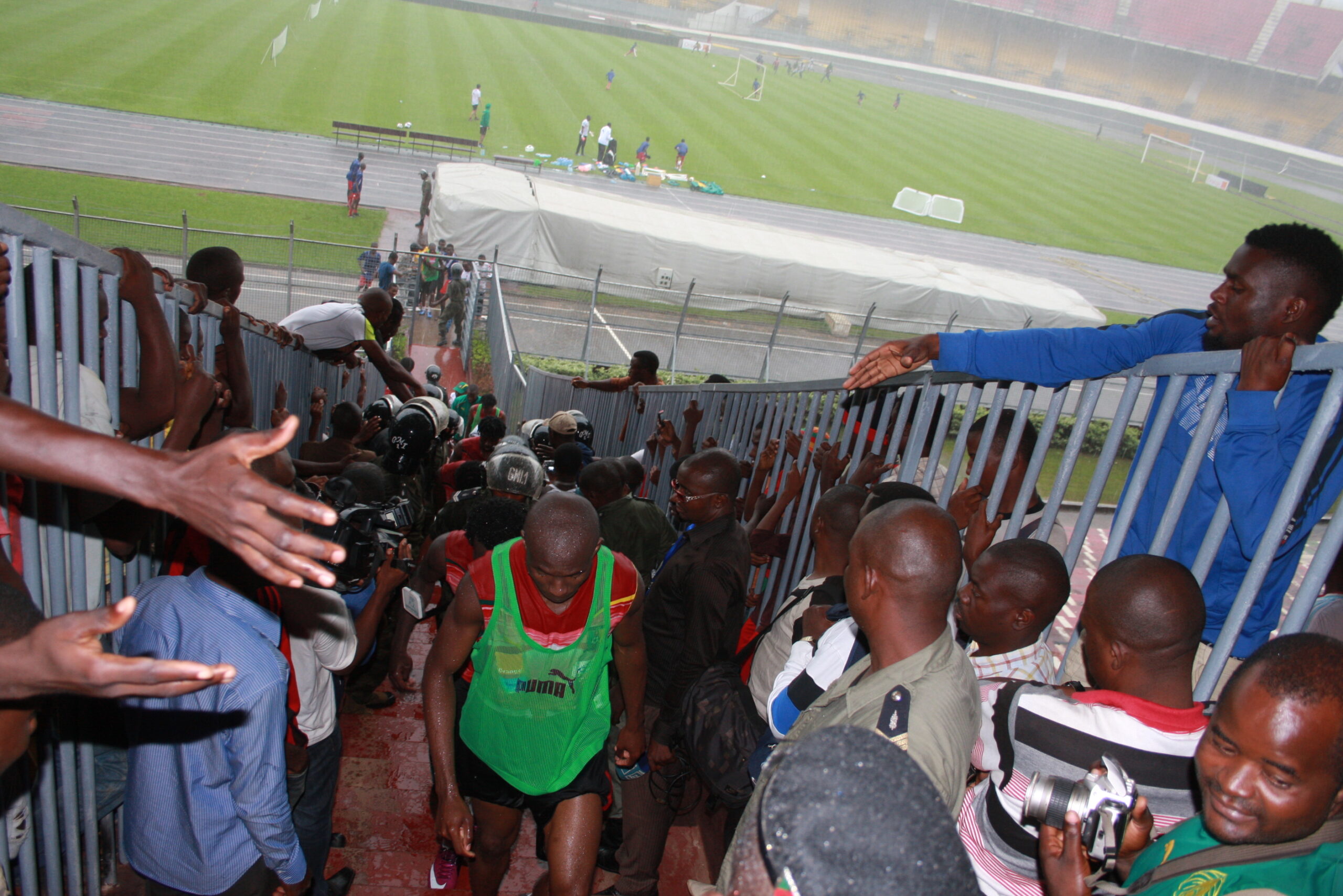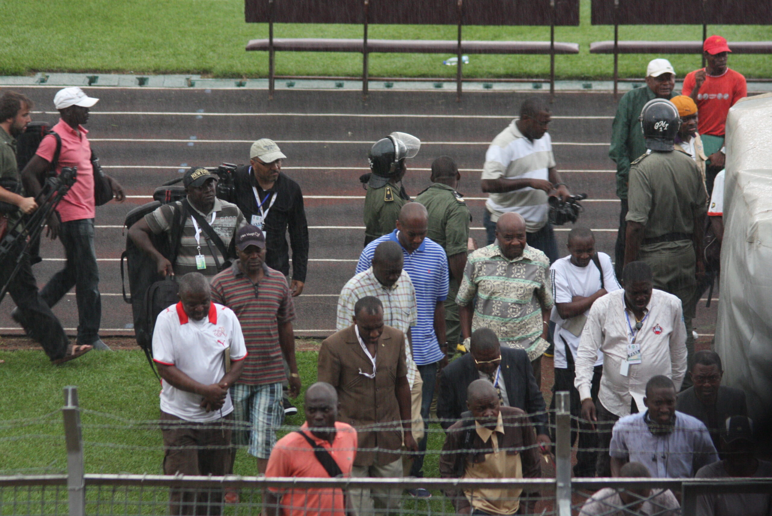 Jacques Songo’o, l’un des responsables du staff technique resté sur la pelouse, a été dépassé par les évènements. Pendant ce temps, la pluie redouble d’intensité. La police assiste à l’envahissement de la pelouse depuis les tribunes. Le coach en charge des gardiens de buts appelle à l’aide. La réaction arrive tardivement. Les hommes en treillis descendent les escaliers à grandes enjambées, et se lancent enfin à la poursuite des envahisseurs.