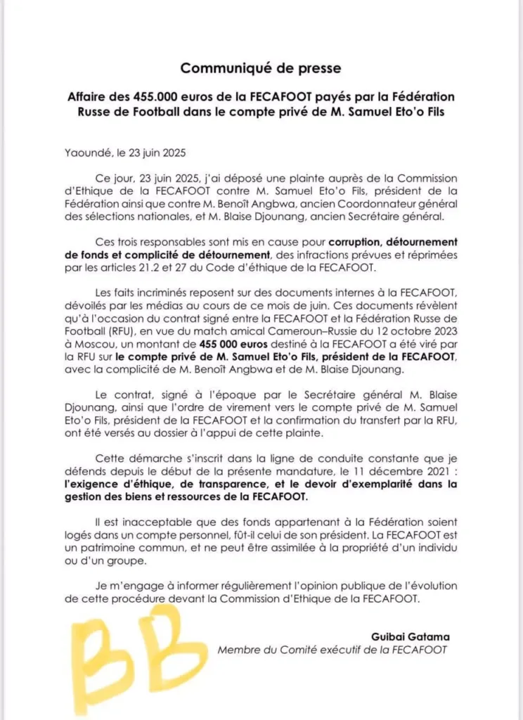 Guibai Gatama vient de porter plainte contre Samuel Eto’o Fils. C’est dans le cadre d’une affaire de « 445 000 euros de la Fécafoot payés par la Fédération Russe de football dans le compte privé de Samuel Eto’o ». En effet, les motifs exposés par le membre du Comex sont longs comme un bras.