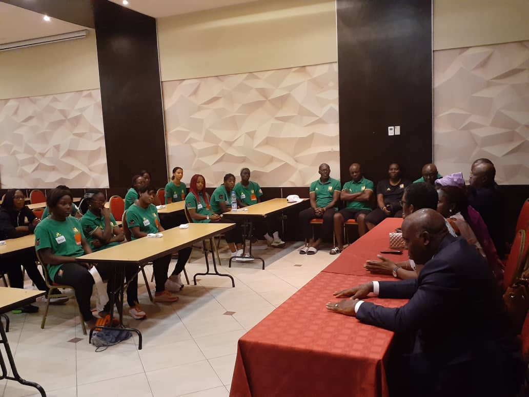 Ce lundi soir, les autorités camerounaises, conduites par la représentante de l’Ambassadeur du Cameroun en RDC, Mme Monique Gwet, a encouragé les Lionnes au nom de la Nation.