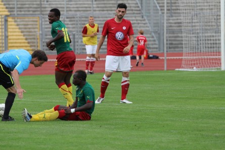 Pour venir a bout de son adversaire du jour, le coach Engelbert Mbarga favorisera le 4-4-2 classique. Un système pour ne pas prendre de risque (?). Toujours est-il que la première période sera un calvaire pour ses poulains. Timide entame du match, erreur de placement et absence d’un vrai leader au milieu de terrain vont payer cash. Merle (10.) puis Schmeer (22.) vont rapidement profiter de la faiblesse du couloir gauche pour inscrire les deux premiers buts de la partie. Contre toute attente, c’est Moussima, joueur du FC Barcelone, qui va payer les frais en cédant sa place à Ouambé (26). Il faut dire que le choix de jouer sur de longues balles n’a pas l’effet escompté. Et c’est avec une grande sérénité que les allemands regagnent les vestiaires à la mi-temps.