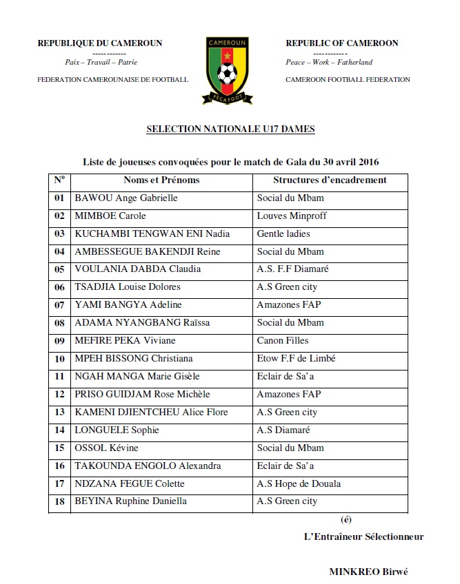 En vue du match de gala du 30 avril 2016 au stade de Bafoussam contre une sélection de la région de l’Ouest, le sélectionneur national des Lionnes U17 a convoqué 18 joueuses qui se sont retrouvées jeudi matin au Centre technique de la Fecafoot à Odza, avec une séance d’entraînement à 13h.