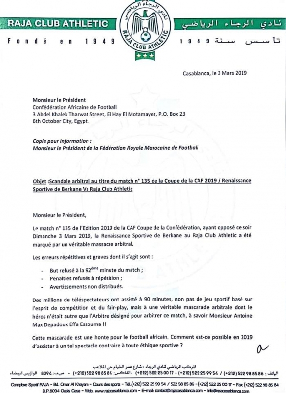 Cette décision fait suite à la plainte déposée par le Raja auprès de la CAF. Le club casablancais s’est dit victime d’un arbitrage catastrophique, qui l’a privé d’une victoire contre la RSB.