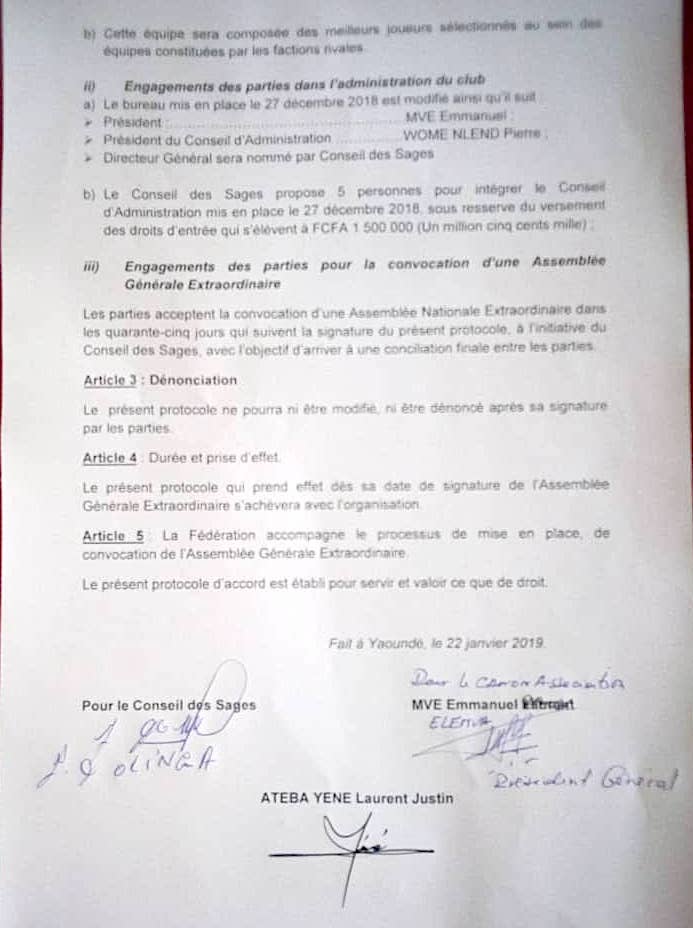 Ainsi, Pierre Womé conserve son poste de Président du Conseil d’Administration, Emmanuel Mvé celui de président. Le Conseil des sages nommera un directeur général et proposera cinq personnes pour intégrer le Conseil d’Administration mis en place le 27 décembre 2018 sous réserve de payer les droits d’entrée qui s’élèvent à 1 500 000 F CFA.