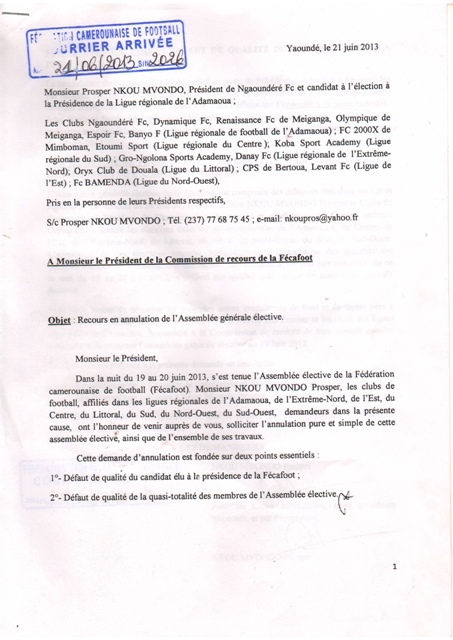 En plus des requêtes de Marlène Emvoutou et de John Ndeh, Nkou Mvondo, le président de Ngaoundéré Fc a également saisi (le 21 Juin 2013, ndlr) la Commission des recours de la Fédération camerounaise de football, aux fins de voir l’élection d’Iya Mohammed du 19 juin dernier annulée.