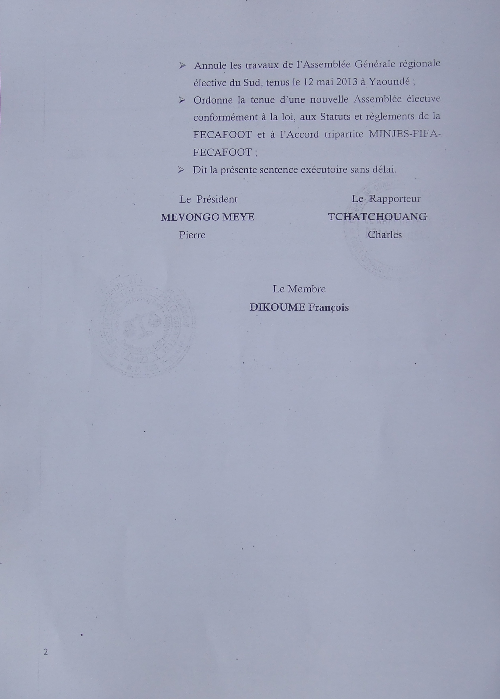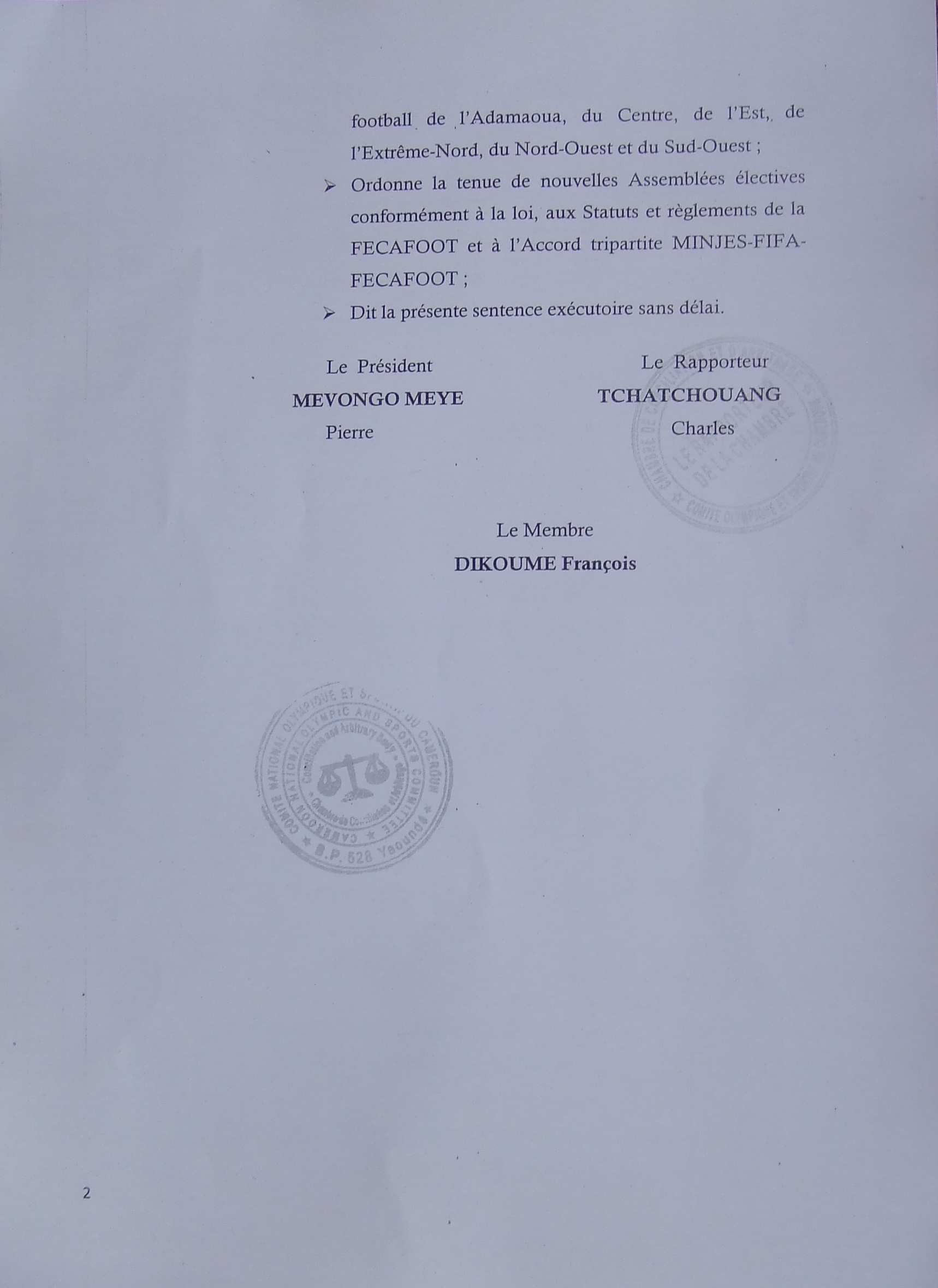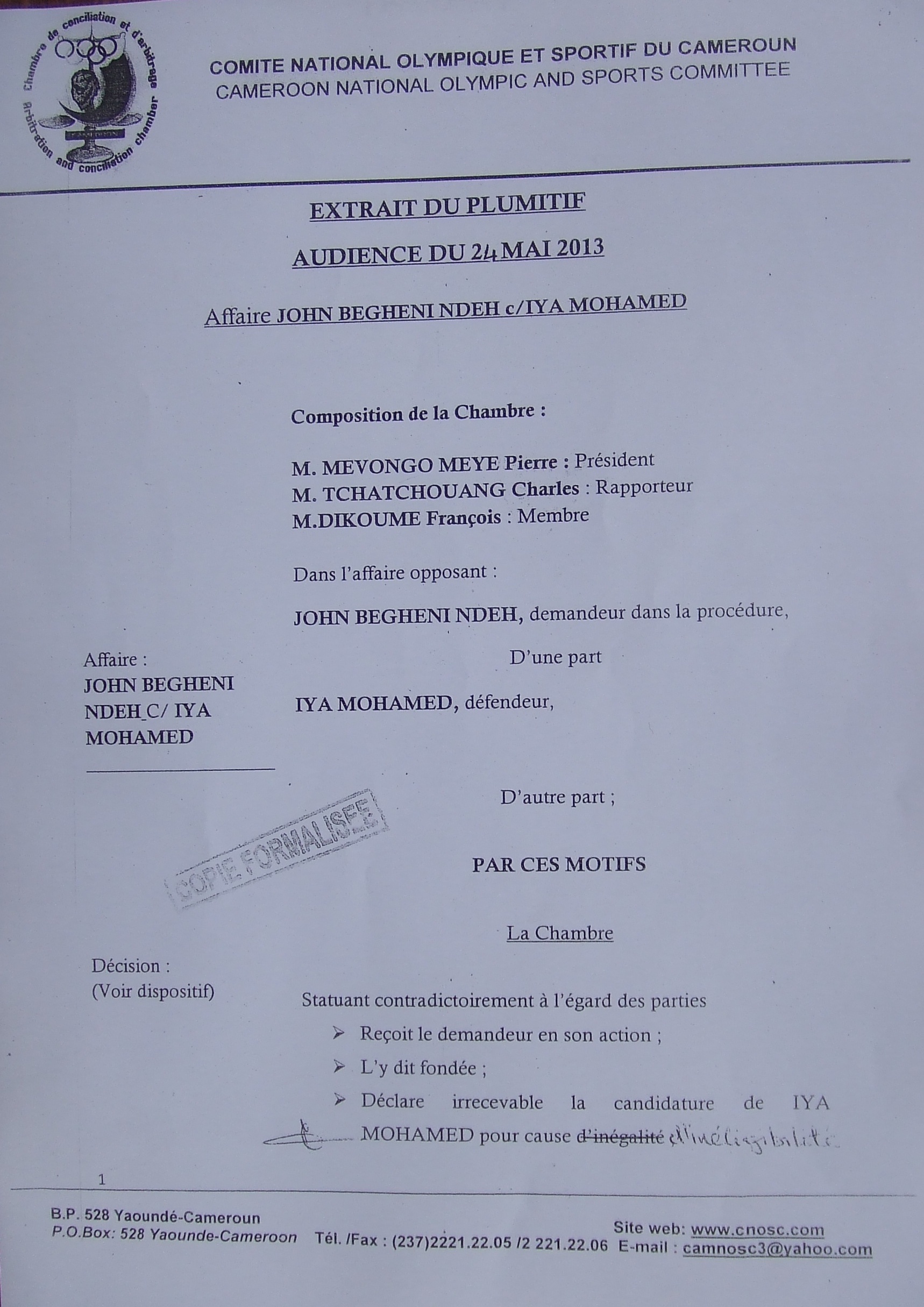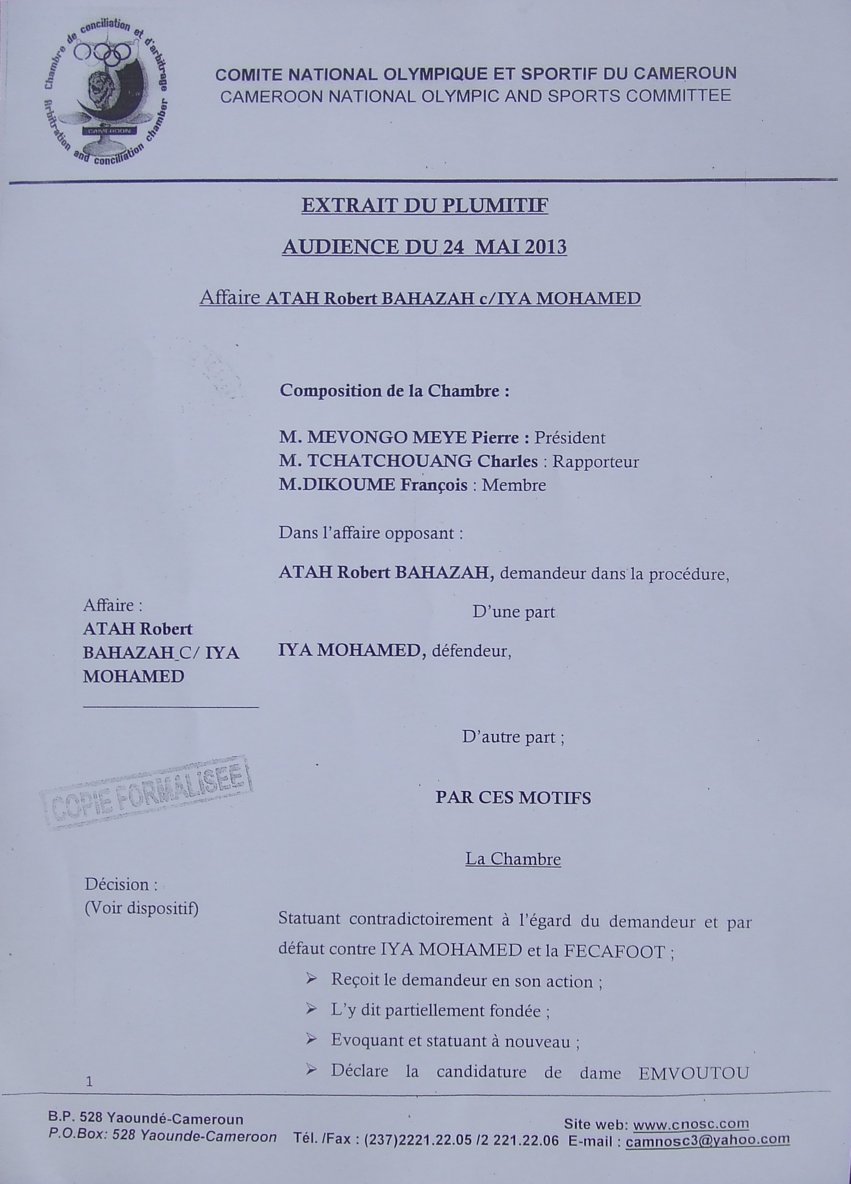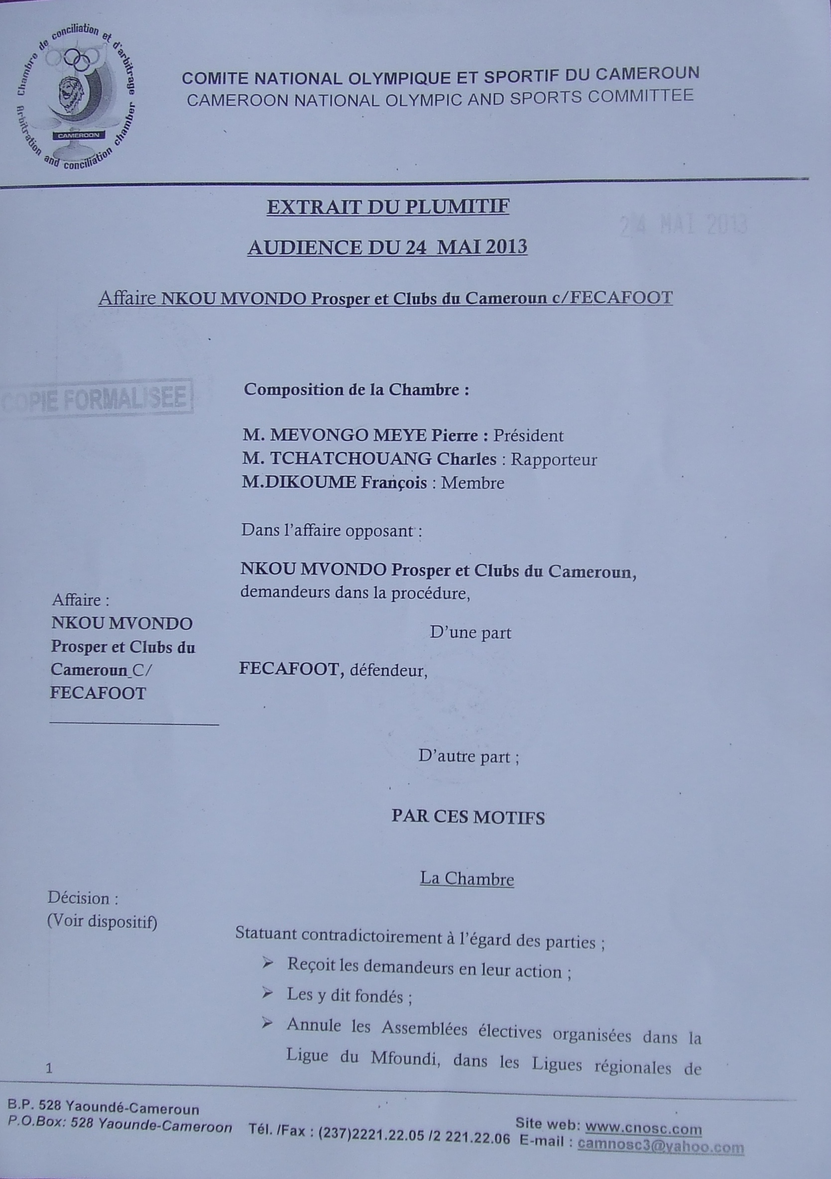 S’il n’a pas été possible pour nous d’entrer en possession de la décision de Philémon Yang, Premier Ministre, demandant à la Fécafoot de reporter l’Assemblée générale élective programmée pour ce samedi, 25 mai 2013, nous vous faisons découvrir, les décisions de la Chambre d’arbitrage et de conciliation du Comité national olympique et sportif du Cameroun.