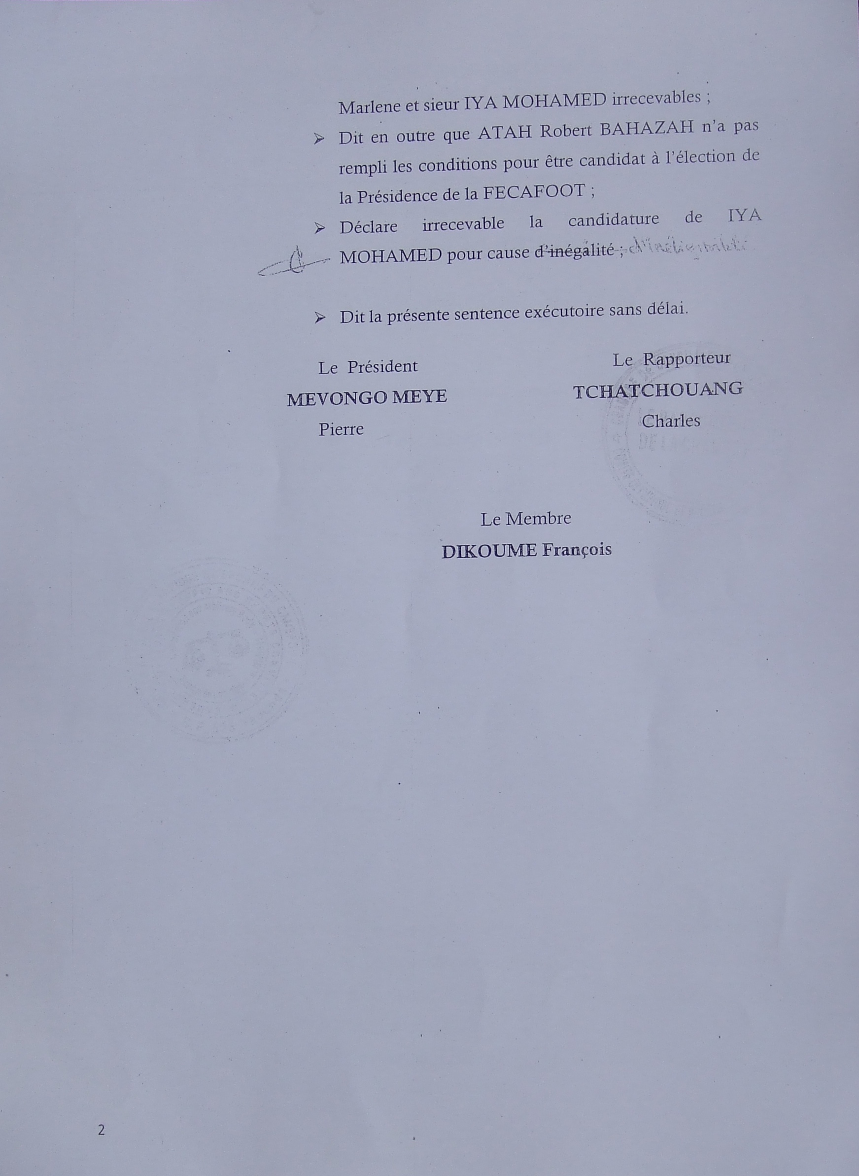 La deuxième, suivant la requête de Robert Atah Behazah, directeur technique national-adjoint et candidat à la présidence de la Fécafoot, déclare « la candidature de dame Emvoutou Marlène et Iya Mohammed irrecevables » et déboute l’intéressé, parce qu’il « n’a pas rempli les conditions pour être candidat à l’élection de la présidence de la Fécafoot ».