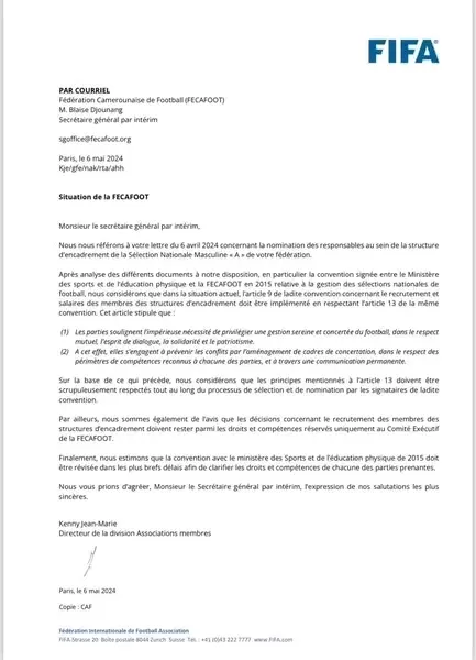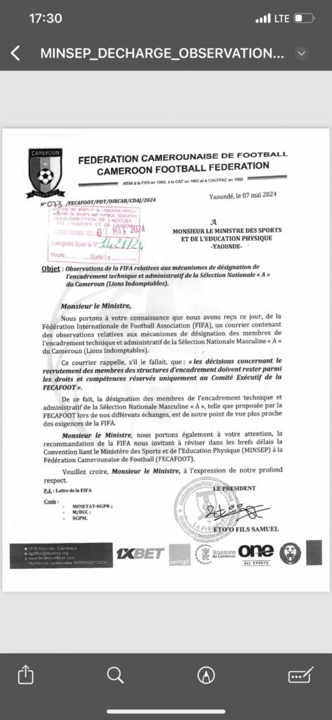 Une correspondance de la FIFA vient semer le doute dans la résolution du conflit entre la Fecafoot et le Minsep.