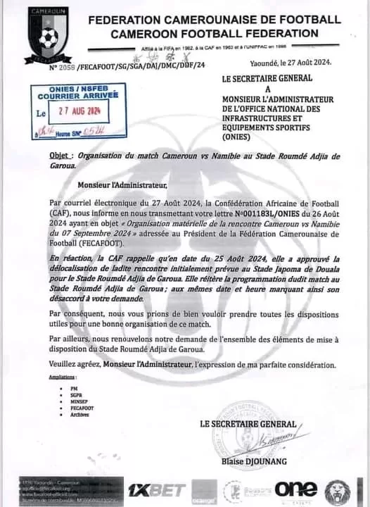 Après avoir annoncé à la Fecafoot l’indisponibilité du stade Roumdé Adjia de Garoua, l’Onies vient de recevoir un courrier de la part de Fecafoot. Celui-ci signé de son secrétaire général Blaise Djounang.