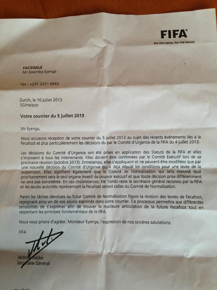 Jérôme Valke, le secrétaire général de la Fifa, dans une correspondance datée du 10 juillet dernier, en réponse à celle de John Ndeh de le 5 du même mois, ne soutient que le secrétaire général de la Fécafoot reconnu reste le même.
