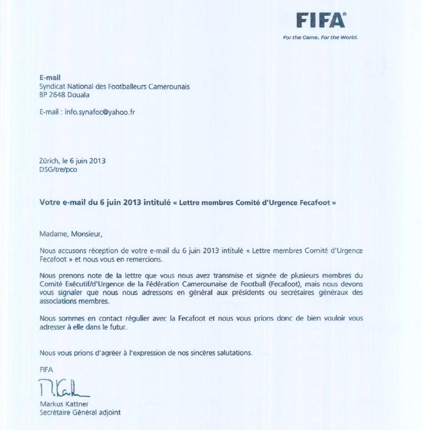 Dans une correspondance signée de Markus Katner, le secrétaire général-adjoint de la Fifa, il est dit à John Begheni Ndeh, David Mayebi, Antoine Depadoue Essomba Eyenga, Alioum Alhadji et autres du Comité d’Urgence qu’ils ne sont pas des interlocuteurs valables de l’instance faîtière du football mondial. Lisez cette correspondance.