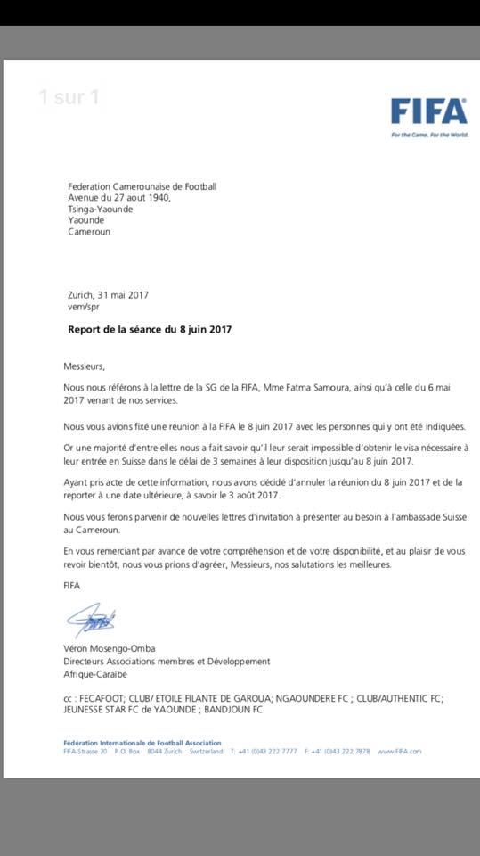 Initialement prévue dans une semaine à Zurich, la réunion de conciliation convoquée par la Fédération internationale de football association vient d’être reportée au 03 août prochain. Dans une lettre signée du Directeur des associations membres et développement Afrique-Caraïbes et adressée aux concernés, l’instance brandit comme motif, la difficulté pour certains protagonistes à obtenir un visa d’entrée en territoire Suisse.