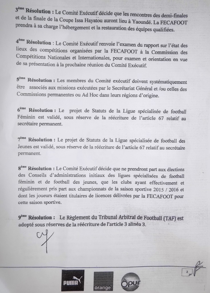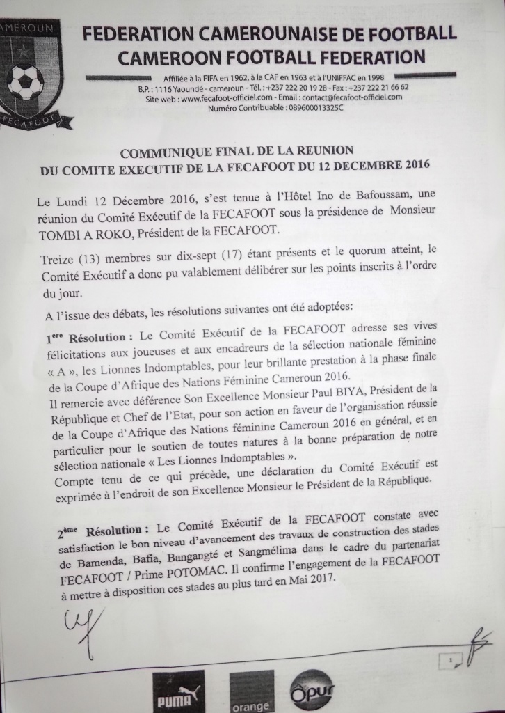 Fécafoot : communiqué final de la réunion du bureau exécutif