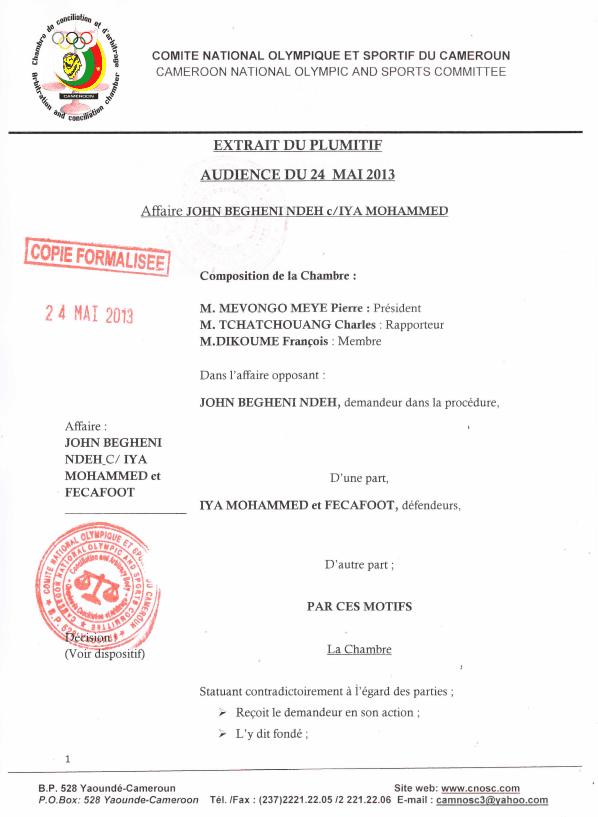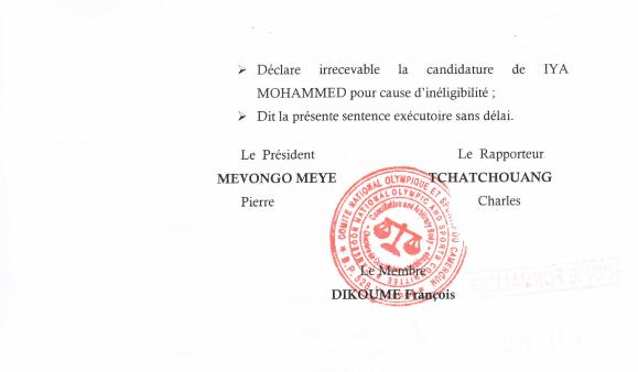 La chambre de conciliation et d’arbitrage du Comité National Olympique et Sportif Camerounais a invalidé ce vendredi 24 mai 2013 la candidature de Iya Mohammed, candidat à sa propre succession à la présidence de la fédération camerounaise de football (Fecafoot).