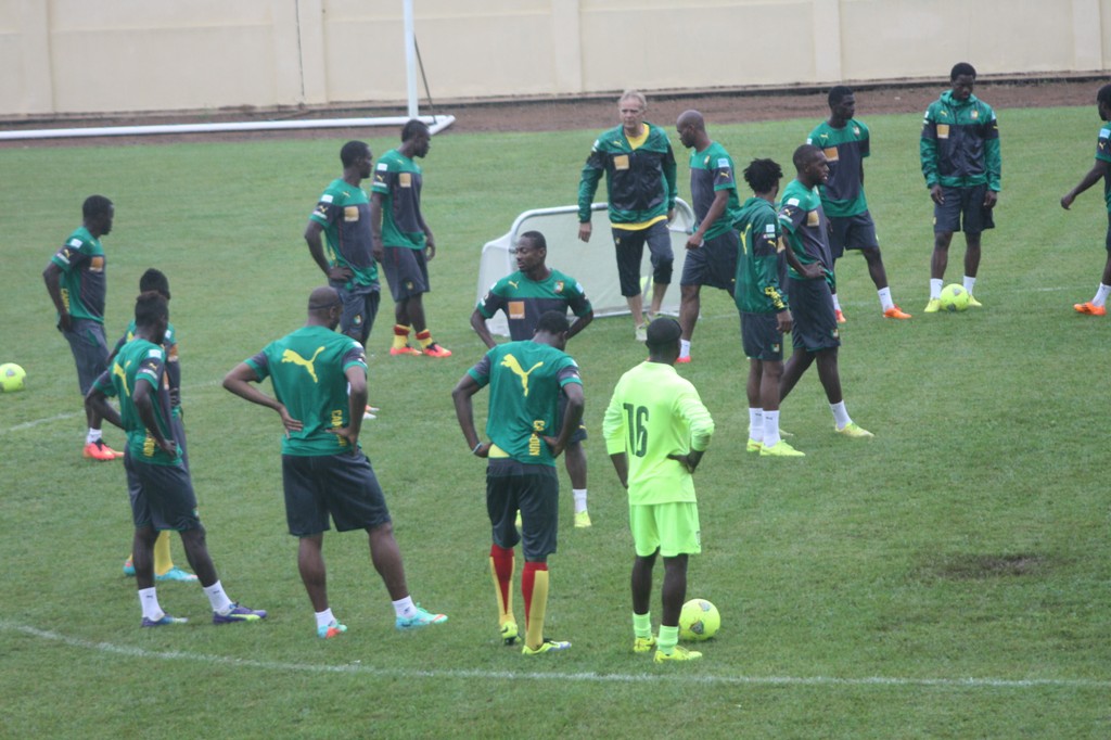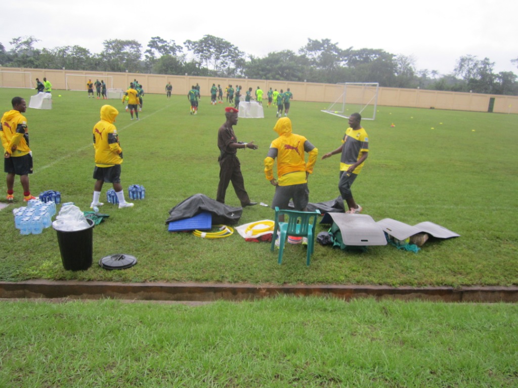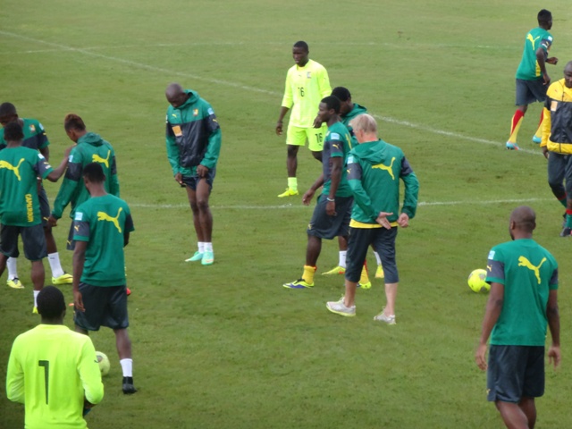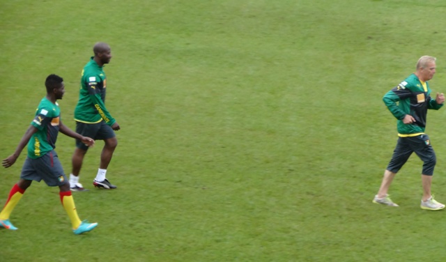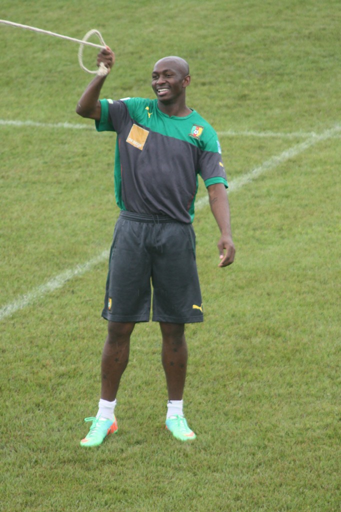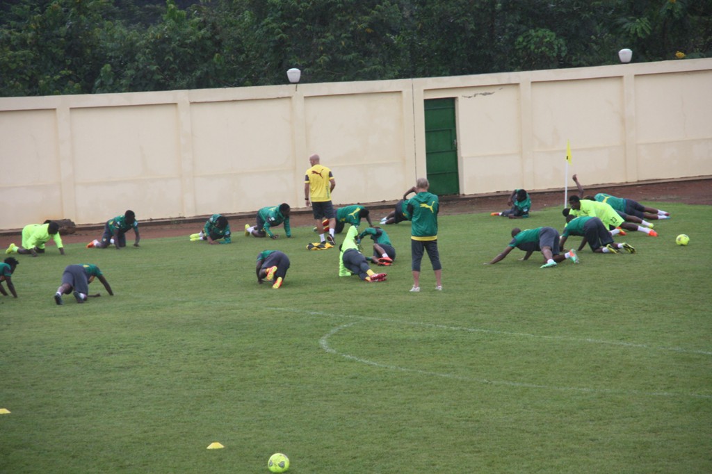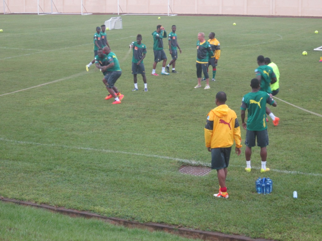 Stéphane Mbia et ses copains ont procédé au réveil musculaire en trottinant sous la coordination du préparateur physique français Christophe Manouvrier. Celui-ci a passé directement la main à l’entraineur en chef Volker Finke et son assistant, le Ghanéen Ibrahim Tanko, qui assurent la continuité avec de petits exercices moins physiques, mais plutôt taquins. Puis l’équipe est surprise par dame pluie qui ne parvient néanmoins pas à perturber cette deuxième séance après celle de la matinée. Les joueurs se mettent aux exercices avec le ballon dans de petits espaces, question de rechercher davantage de cohésion dans le jeu. Un mini-match d’une vingtaine de minutes s’en est suivi sur une moitié du stade avec l’ensemble des joueurs, disposés dans deux équipes disparates, l’une avec des chasubles et l’autre vêtue par la tenue d’entrainement. Et c’est sous cette pluie que les joueurs ont terminé cette dernière séance d’entrainement de la journée.