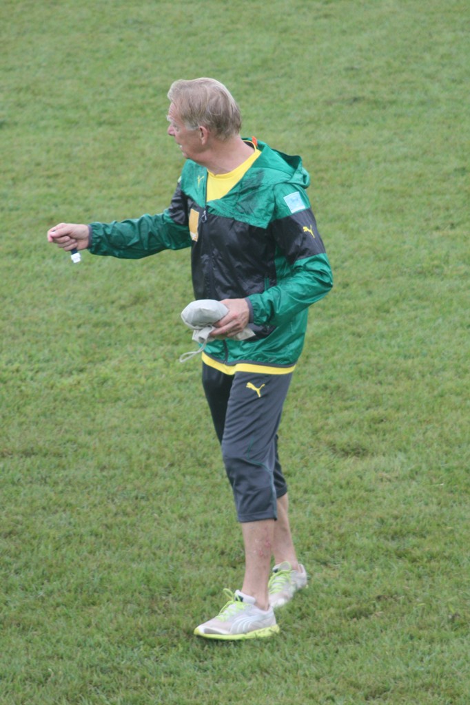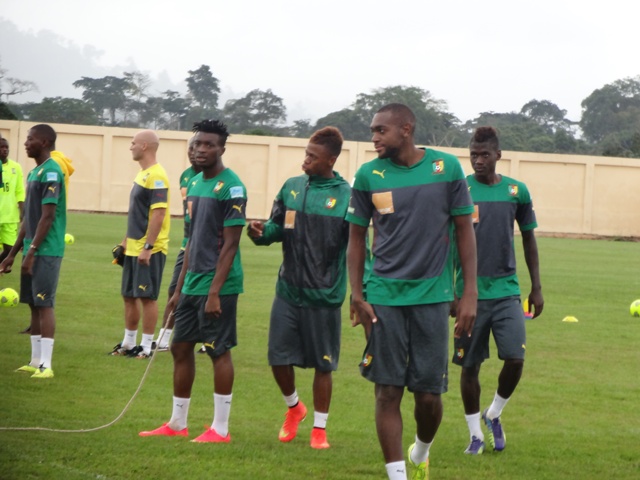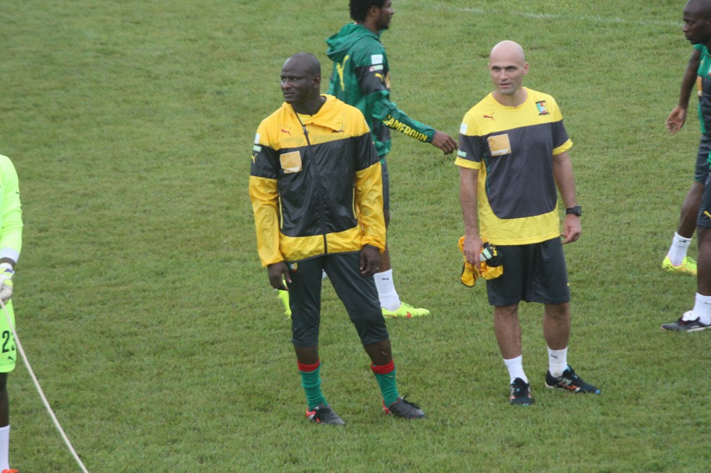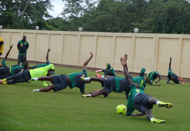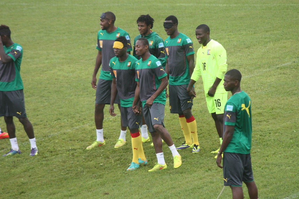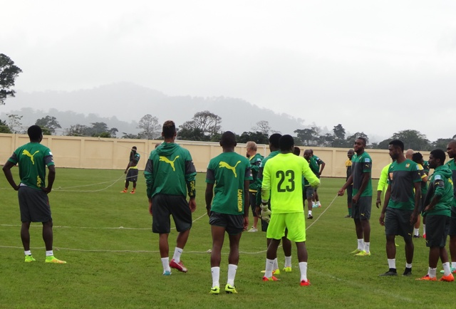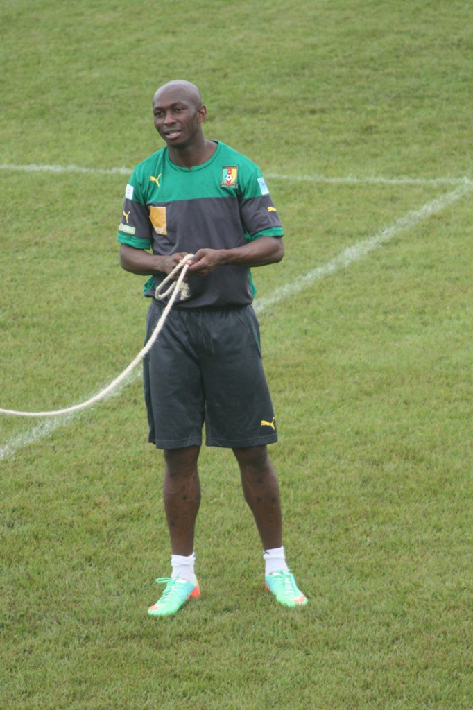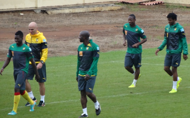 Stéphane Mbia et ses copains ont procédé au réveil musculaire en trottinant sous la coordination du préparateur physique français Christophe Manouvrier. Celui-ci a passé directement la main à l’entraineur en chef Volker Finke et son assistant, le Ghanéen Ibrahim Tanko, qui assurent la continuité avec de petits exercices moins physiques, mais plutôt taquins. Puis l’équipe est surprise par dame pluie qui ne parvient néanmoins pas à perturber cette deuxième séance après celle de la matinée. Les joueurs se mettent aux exercices avec le ballon dans de petits espaces, question de rechercher davantage de cohésion dans le jeu. Un mini-match d’une vingtaine de minutes s’en est suivi sur une moitié du stade avec l’ensemble des joueurs, disposés dans deux équipes disparates, l’une avec des chasubles et l’autre vêtue par la tenue d’entrainement. Et c’est sous cette pluie que les joueurs ont terminé cette dernière séance d’entrainement de la journée.