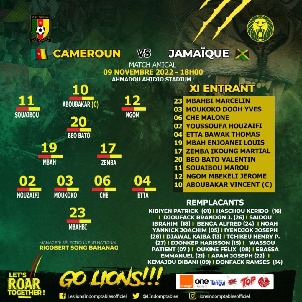 Rigobert Song va diriger des Lions Indomptables en majorité locaux dans ce match international. Le capitaine de la sélection nationale, Aboubakar Vincent, est le seul professionnel de la diaspora, présent sur le terrain au coup d’envoi. C’est le seul de ce groupe certain d’accompagner le groupe au Qatar.