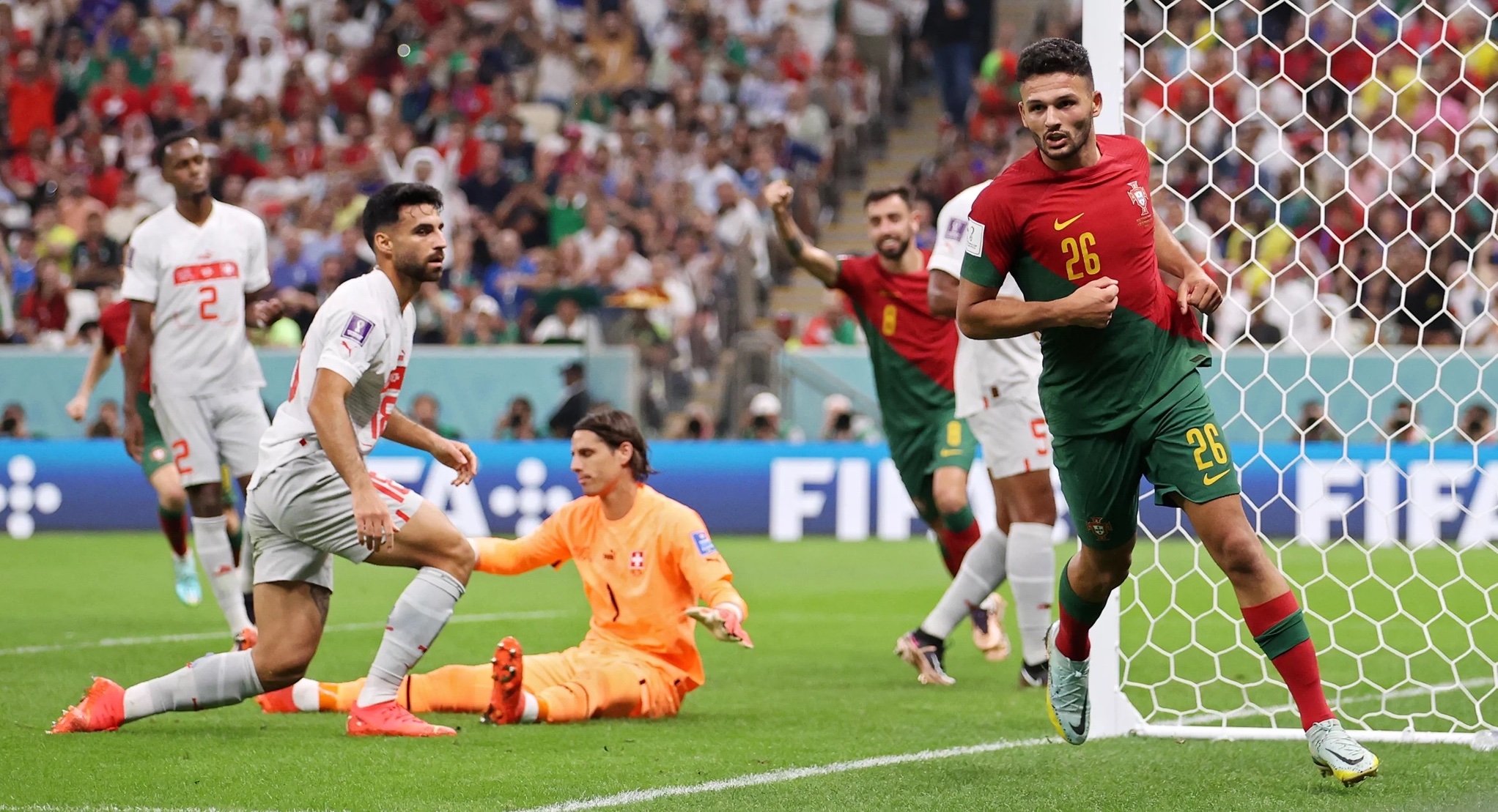 João Félix va le servir généreusement et l’attaquant de Benfica va envoyer la balle au fond du filet de Yann Sommer (17e). Xherdan Shaqiri va trouver le poteau adverse suite à un coup franc (30e). Mais c’est sur un corner de Bruno Fernandes que le Portugal va ajouter une autre réalisation par l’intermédiaire de Pepe (2-0, 32e). Avec ce but, il devient à 39 ans et 283 jours, le plus vieux buteur dans un match à élimination directe en phase finale de Coupe du monde.