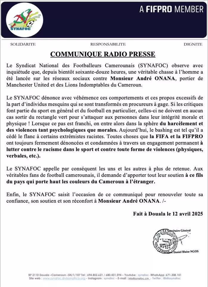 Dans un communiqué daté du 12 avril, le Syndicat national des footballeurs camerounais (Synafoc) vole au secours d’André Onana. Ce regroupement de défenses des droits des footballeurs s’insurge contre le harcèlement subi par le gardien de Manchester United depuis 72 heures. Des insultes fusent de toute part ; des attaques qui s’éloignent parfois du cadre footballistique.