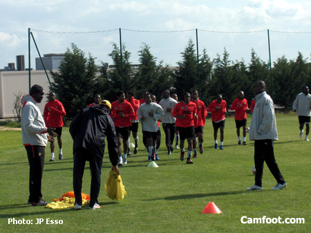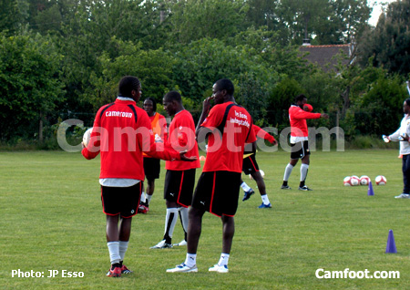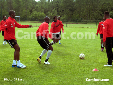 Un premier groupe se passe le ballon, groupe composé de Atouba, Matoukou, Meyong, Gérémi, Olembe, Alioum, Feutchiné et Souleymanou. De l’autre côté sont réunis Makoun, Mbia, Webo, Bikey, Ngom Komé, Douala, Kameni et Wamfor. Footing, étirements, « taureau » et mini-match sont également au menu de joueurs qui semblent motivés malgré la coupure de leurs vacances.