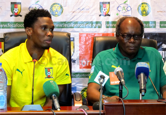 Il pourrait y avoir de l’Epervier au menu du Lion, ce samedi, à l’occasion du match comptant pour la troisième journée des éliminatoires de la Coupe du monde 2014, entre le Cameroun et le Togo au stade Omnisports de Yaoundé. C’est le souhait des Camerounais en tout cas. Des Lions Indomptables, aussi. « Nous n’avons qu’un seul souhait et qu’un seul objectif : c’est de remporter le match samedi, devant le public Camerounais », a déclaré Jean Paul Akono, le sélectionneur national, au cours de la traditionnelle conférence de presse d’avant match organisée ce vendredi au Centre d’excellence de la Confédération africaine de football (CAF) à Mbankomo. Il était en compagnie du capitaine de la sélection nationale, Samuel Eto’o.