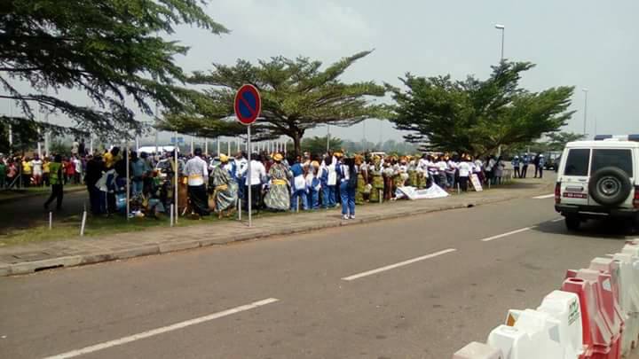 Le cortège, encadré par les forces de police, vient de quitter Nsimalen pour l’hotel Mont Fébé où se poursuivra la fête.