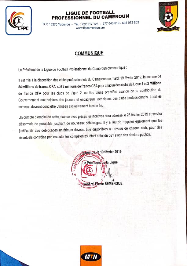 Le Cameroun aime à se faire donner des ordres de l’extérieur. C’est le constat qui peut se dégager des réalités locales. La FIFA a donné un ultimatum à la Fédération en ce qui concerne les salaires impayés. Ce mardi, la Ligue a rendu public une correspondance dans laquelle elle invite les clubs à venir décharger une première avance de la contribution du gouvernement aux salaires des joueurs et encadreurs techniques des clubs professionnels. Chaque club de Ligue 1 percevra 3 millions et ce sera 2 millions pour ceux de Ligue 2.