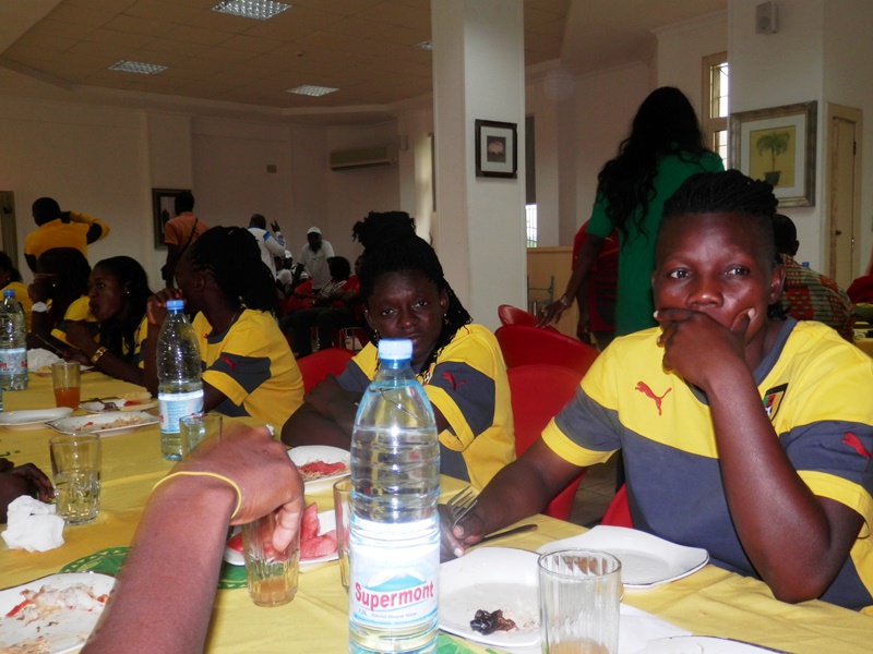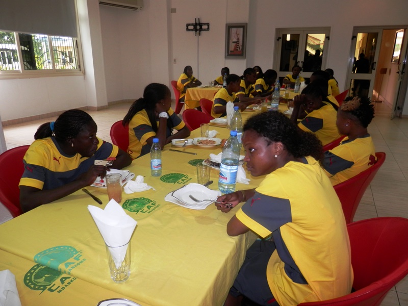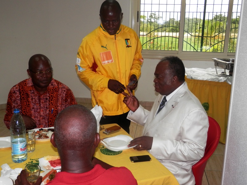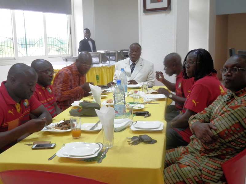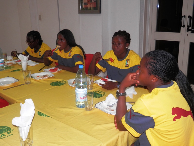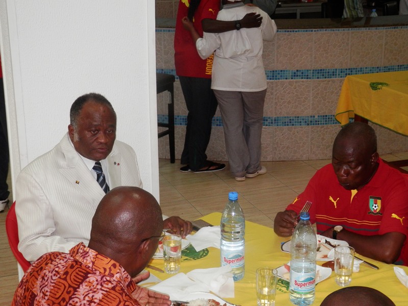 Joseph Owona est arrivé pile à 13h (heure locale) au Centre d’excellence de la Confédération africaine de football (Caf), ce jeudi. Venu rendre visite à la sélection nationale fanion de football féminin qui devrait se rendre ce soir à Vancouver en marge du Mondial de Canada 2015, le président du Comité de normalisation de la Fédération camerounaise de football (Fécafoot) a rejoint les Lionnes Indomptables et leur staff technique au restaurant du Centre, qui a finalement servi de cadre pour le message de la Fécafoot aux ambassadrices camerounaises. Images.