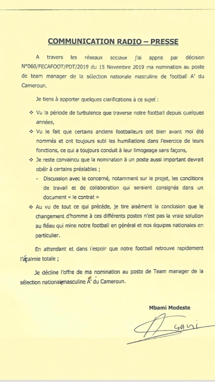 Il a appris sa nomination comme Team Manager des Lions A’ à travers les réseaux sociaux, au même titre que tout le monde. Mais l’ancien milieu de terrain des Lions Indomptables ne comprend pas que certaines façons de faire n’aient pas été respectées. Il les a d’ailleurs énuméré dans un document qu’il a lui aussi présenté à travers les réseaux sociaux pour décliner sa nomination. Il « tire aisément la conclusion que le changement d’homme … n’est pas la vraie solution qui mine notre football en général et nos équipes nationales en particulier »