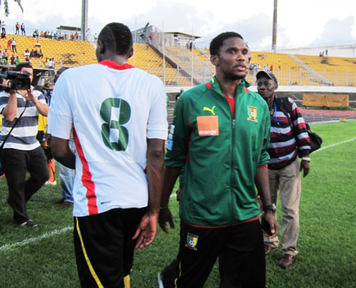 Après une légère blessure contractée mardi soir à l’entraînement, le quadruple ballon d’or africain Samuel Eto’o est resté à l’hôtel durant la séance de mercredi matin. Mais le joueur vedette de la sélection nationale de football du Cameroun a tenu à rassurer ses coéquipiers ainsi que l’ensemble des supporters qu’on pouvait compter sur lui à Mfandena lors du match amical opposant les lions indomptables à la Jeunesse Sportive de Ngolmekong.