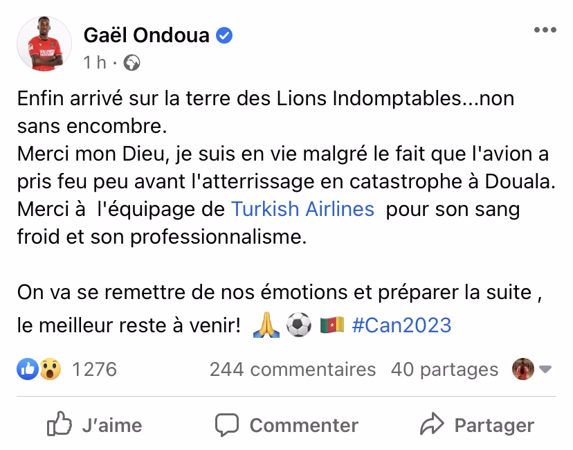 « Enfin arrivé sur la terre des Lions Indomptables… non sans encombre. Merci mon Dieu, je suis en vie malgré le fait que l’avion a pris feu avant l’atterrissage en catastrophe à Douala », a t-il écrit sur Facebook.