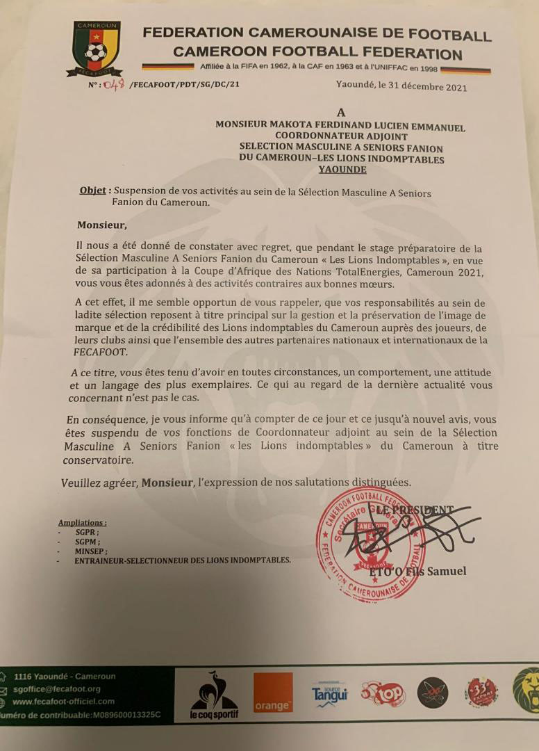 Selon certaines indiscrétions, Ferdinand Makota estimerait avoir été suspendu de ses fonctions de Coordonnateur adjoint de l’équipe nationale fanion de football du Cameroun, « sans raisons valables, ni motifs sérieux et surtout en violation flagrante de tous les textes de la Fédération camerounaise de football ».