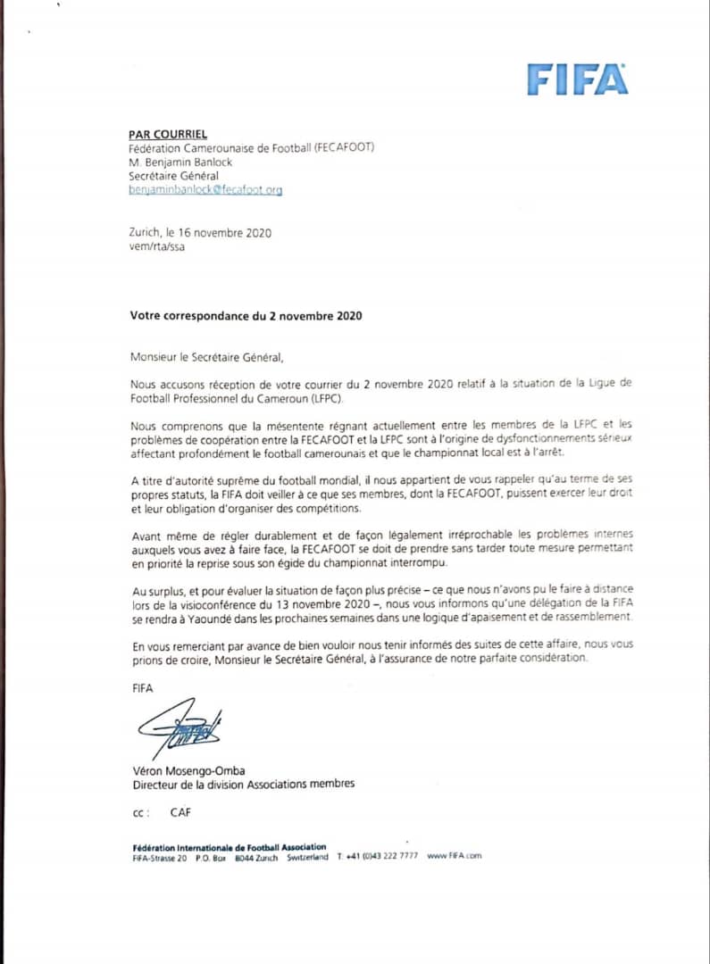 La FIFA a adressé une correspondance ce mardi au Secrétaire Général de la Fécafoot pour donner sa vision par rapport aux différends sans fin entre les acteurs du football camerounais. Ayant certainement compris qu’une seule réunion, qui fut en plus virtuelle, ne pouvait donner l’envergure nécessaire à la compréhension des problèmes existants, elle a décidé d’envoyer une délégation de la FIFA sur place pour cerner les difficultés.