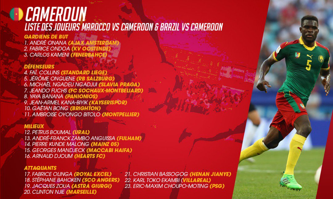 Tags: André OnanaArnaud DjoumChoupo-MotingChristian BassogogClinton NjieFabrice OlingaFabrice Ondoa EbogoFai CollinsGaétan BongGeorges MandjeckIdriss Carlos KameniJacques ZouaJean Armel Kana-BiyikJeando FuchsJérôme OnguénéMichael Ngadeu NgadjuiOyongo BitoloPetrus BoumalPierre Kunde MalongStéphane BahokenToko EkambiYaya BananaZambo Anguissa