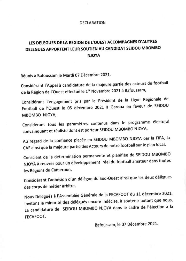 Mardi n’aura pas été une très belle journée pour Samuel Eto’o dans la course contre la montre pour fidéliser les délégués qui voteront le prochain président de la Fécafoot. C’est d’abord Jules Denis Onana qui va surprendre le lanterneau en annonçant qu’il ne laisserait pas la place au Pichichi. Puis, malgré l’apparence de bonne nouvelle avec la décision de la CCA d’annuler la candidature de son ancien associé, Mbombo Njoya l’a nargué en présentant signature à l’appui la défection d’un des délégués du Sud-Ouest.