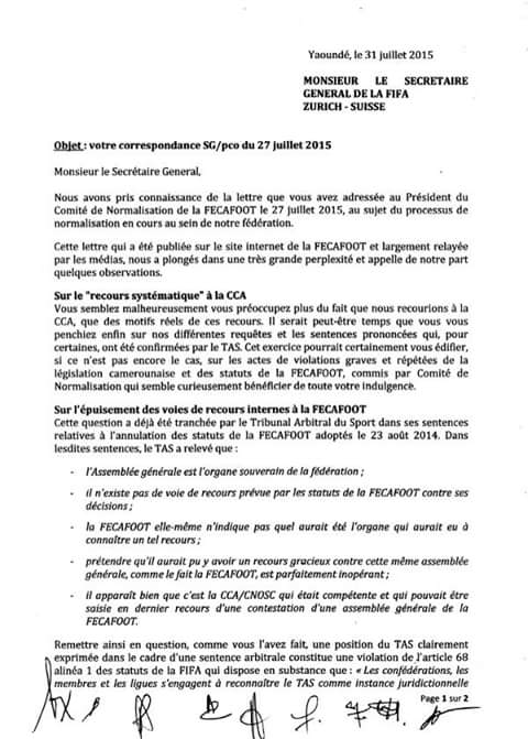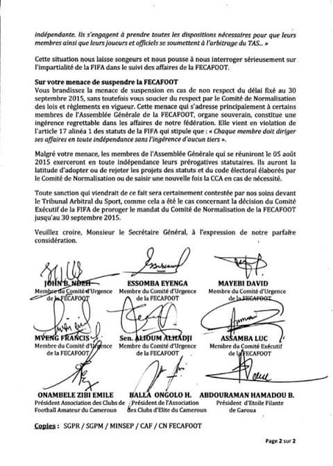 Dans sa lettre du 27 Juillet dernier, le SG de la FIFA soulignait qu’en cas d’échec de l’exécution du nouveau chronogramme présenté par l’équipe de Joseph Owona, il n’y aura « d’autre choix que de saisir une nouvelle fois les autorités compétentes de la FIFA afin qu’elles prennent les sanctions adéquates, ces dernières incluant une probable suspension de la FECAFOOT ».