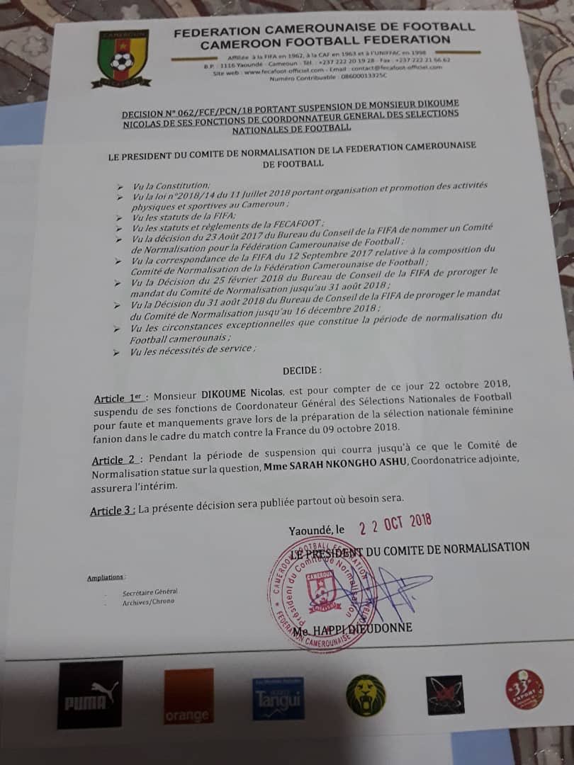 Si pour tous les ratés qui étaient survenus lors de la préparation du match amical contre la Guinée en France il n’y a eu aucune conséquence, le président du Comité de Normalisation a décidé de suspendre de ses fonctions le coordonnateur général des sélections nationales pour les manquements constatés lors de la préparation des Lionnes pour le match amical contre la France.