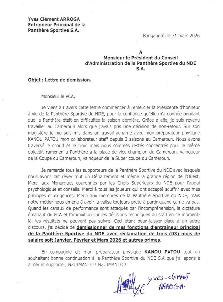 Clément Arroga n’est plus l’entraîneur de la Panthère sportive du Ndé. L’ancien sélectionneur des Lions A’ vient de jeter l’éponge. En effet, le technicien a envoyé sa lettre de démission ce soir au président du conseil d’administration (PCA), Gelis Djapom. Un départ qui arrive au lendemain du match nul contre Aigle du Moungo et à la veille du match en retard de la 7ᵉ journée de la Mtn Elite One contre Dynamo de Douala.