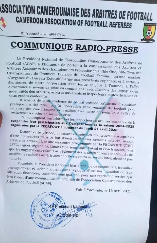 Dans cette période, et tenant compte des manœuvres susceptibles d’être orchestrées dans le but d’instrumentaliser certains arbitres, aucun arbitre ne devra diriger une rencontre programmée par la Fécafoot tant que les engagements relatifs au règlement des arriérés de leurs indemnités de matchs des saisons antérieures et celles en cours ne seront intégralement pas honorés.