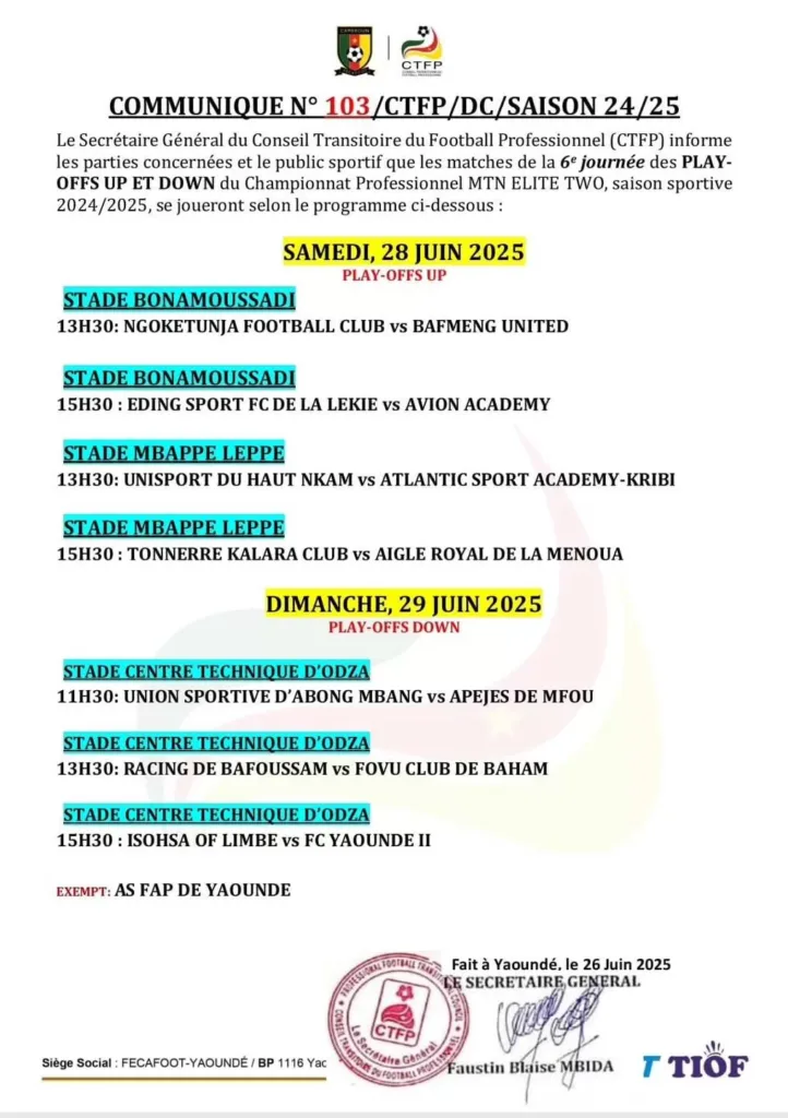 Le Conseil transitoire du football professionnel (Ctfp) vient de programmer la 6e journée des Play-offs dans les deux villes qui accueillent le tournoi. Déjà assuré d’évoluer en Mtn Elite One la saison prochaine, Aigle royal de la Menoua veut désormais terminer champion. En effet, Emaleu et ses poulains sont sur une folle série de 5 victoires en autant de sortie. Ils vont affronter Tonnerre kalara club de Yaoundé ce samedi au stade Mbappé Leppé. En ouverture sur les mêmes installations, Unisport du Haut Nkam prépare sa montée. Le flambeau de l’Ouest affronte Atlantic sport academy de Kribi.