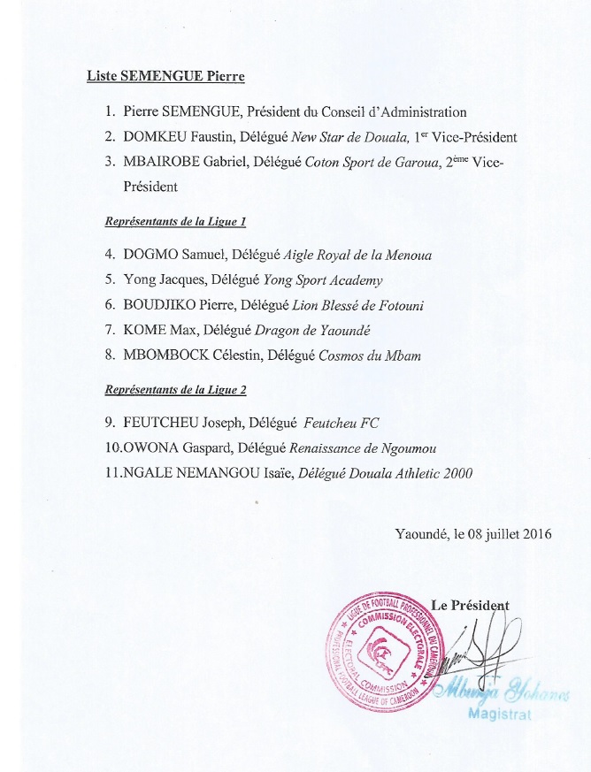 Sur un plateau radio dimanche dernier à Douala, il pense qu’il faut avoir beaucoup d’énergie pour tacler les défis actuels de la Ligue: « Le vieux Semengue a beaucoup travaillé. Il est temps pour lui d’aller se reposer ». Il explique aussi que la Ligue doit revenir aux clubs puisque c’est à eux de s’autogérer et reste confiant: « Vous verrez ce jour qu’on ne le votera pas. Il le sait malgré les intimidations auxquelles subissent beaucoup de présidents de club. Ils savent quoi faire, vous allez voir. La ligue doit revenir aux clubs, un point c’est tout. Ça ne se négocie pas. Et tous les présidents le savent sauf quelques-uns qui sont aller tromper le père en lui demandant de se porter candidat. »