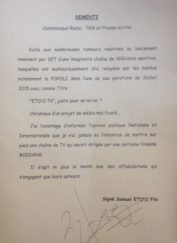« Suite aux nombreuses rumeurs relatives au lancement imminent par SET d’une imaginaire chaine de télévision sportive, lesquelles ont malheureusement été relayées par les médias notamment le POPOLI dans une de ses parutions de juillet 2015 avec comme titre : Eto’o TV, juste pour mirer ? Chronique d’un projet de média mal ficelé… J’ai l’avantage d’informer l’opinion publique Nationale et internationale que je n’ai jamais eu l’intention de mettre sur pied une chaine de TV qui serait dirigée par une certaine Yolande Bodiang, Il s’agit ni plus ni moins que des affabulations qui n’engagent que leurs auteurs»