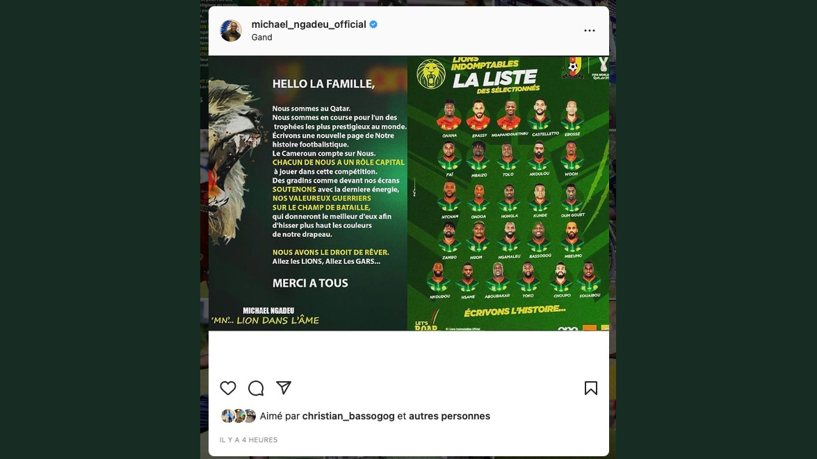 Le Cameroun compte sur Nous. CHACUN DE NOUS A UN RÔLE CAPITAL à jouer dans cette compétition, Des Gradins comme devant nos écrans SOUTENONS avec la dernière énergie, NOS VALEUREUX GUERRIERS SUR LE CHAMP DE BATAILLE, qui donneront le meilleur d’eux afin d’hisser plus haut les couleurs de notre drapeau.