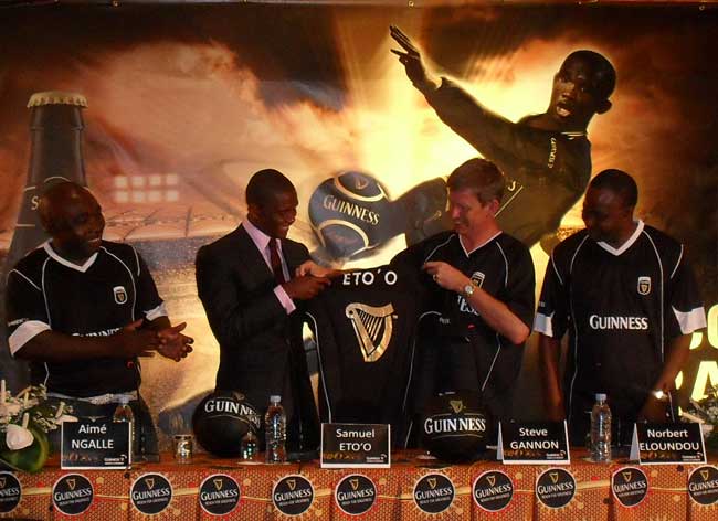 Steve Gannon, Manager général de la société Guinness pour l’Afrique centrale, avant l’entrée de Samuel dans la salle, a tenu à annoncer à la presse le rôle de Samuel en tant que ambassadeur de cette marque : « En sa qualité d’ambassadeur, Samuel Eto’o participera à de nombreux événements avec la marque GUINNESS afin de continuer à rapprocher les fans de football et de leurs idoles. Ce faisant, GUINNESS entend récompenser la Grandeur de ses fidèles consommateurs et fans de football en offrant des cadeaux exceptionnels et des expériences mémorables, gratifiantes et engageantes. Samuel Eto’o agira également en tant que porte-parole dans le cadre du programme de GUINNESS pour la consommation responsable de l’alcool. Ce programme consiste à encourager les consommateurs à respecter les règles du jeu de plusieurs manières, notamment en choisissant entre boire et conduire, et en s’assurant de manger et boire de l’eau entre les boissons alcoolisées. En sa qualité de symbole et d’exemple pour les hommes du Cameroun et du monde entier, son soutien en faveur de cette initiative est d’une valeur inégalée ».