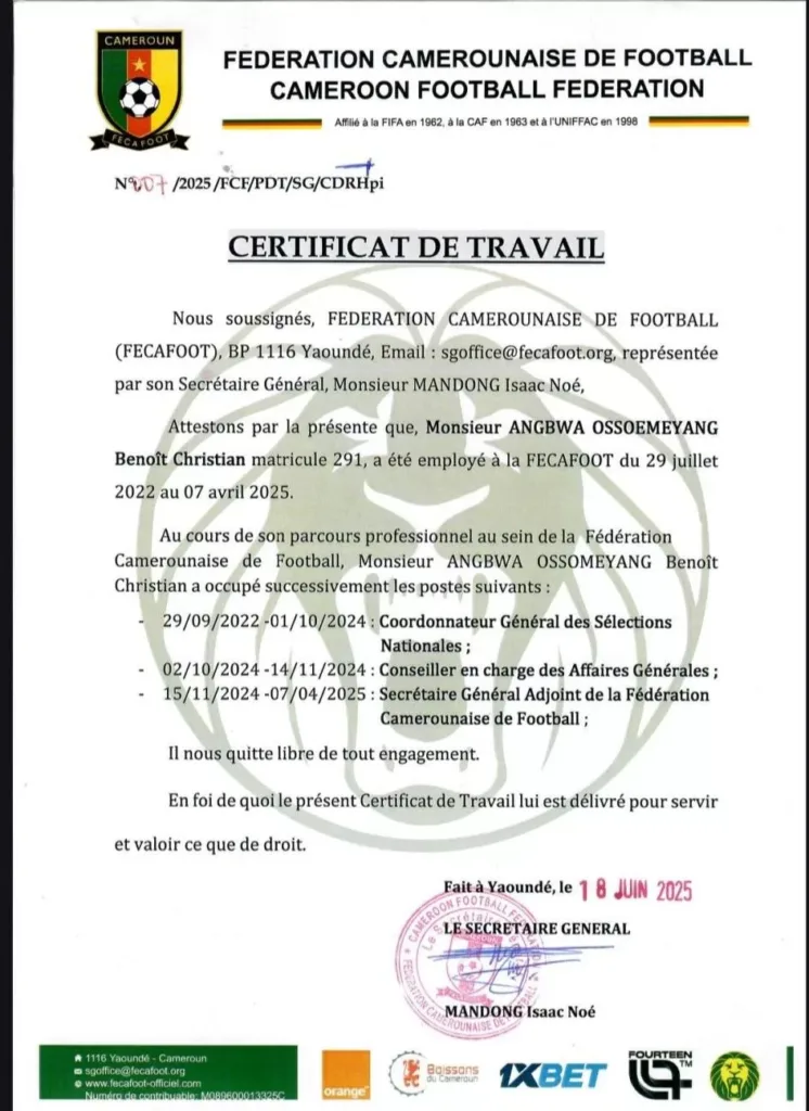 Alors qu’il avait quitté le poste de Coordonnateur Général des Lions Indomptables en octobre 2024, une passation de service en bonne et due forme s’est tenue avec son successeur, Timothé Atouba. Après sa démission comme SGA de la fédé, il a demandé et obtenu de Isaac Mandong, le SG et oncle de Samuel Eto’o, un certificat de travail après avoir remis toutes les dossiers de la Fécafoot.