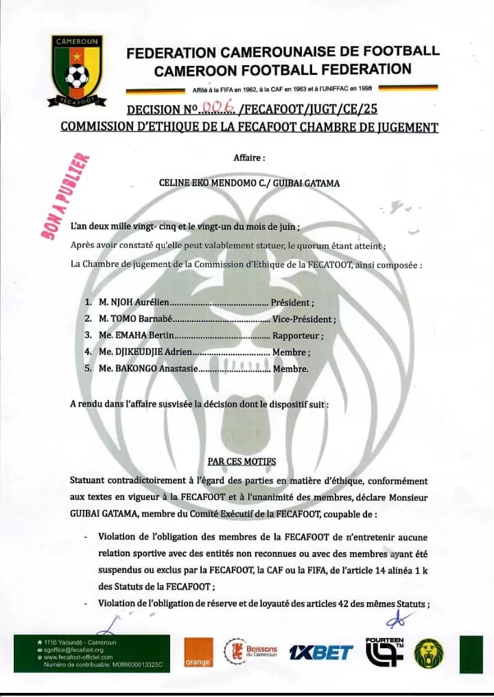 La vice-présidente de la Fédération camerounaise de football (Fécafoot), Céline Eko, obtient la tête de Guibai Gatama. Dans une affaire l’opposant au membre du commission exécutif et Dp du journal Œil du Sahel, la commission d’éthique n’a pas eu la main légère. En effet, plusieurs chefs d’accusations sont retenus contre lui :
