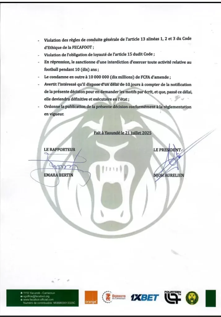 - Violation des règles de conduite générale de l’article 13 alinéas 1, 2 et 3 du Code d’Ethique de la FECAFOOT ;