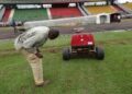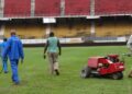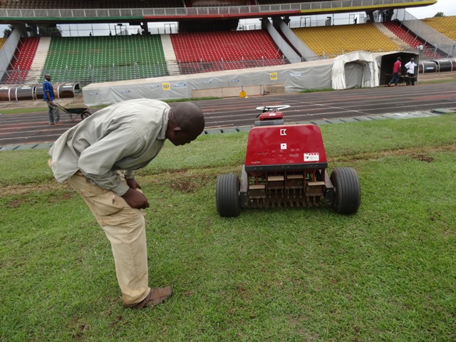 En débarquant dans ce stade, le calme habituel aux jours ordinaires sans match, fait place au vrombissement des moteurs de machines qui sont sur l’aire de jeu. Une dizaine de personnes s’activent, pioches, pelles, râteau et plantoirs à la main. Ici, c’est une aératrice qui est en train de piocher le gazon. Il s’agit d’un « travail d’aération du sol », indique Elvis Timnou, un des techniciens de la direction des stades. « Mon rôle est de faire le travail de plaquage et de repiquage, c’est-à-dire regarnir les zones dénudées. Il y a par exemple le rond-central, qui était complètement dénudé, certains endroits comme les deux lignes de touche et les surfaces de réparation. En ce moment, on est en train d’aérer le sol. Ensuite, on va procéder à l’engraissement. A la fin, on procèdera à la matérialisation de cette aire de jeu. Je suis formé pour ça l’entretien et la matérialisation des aires de jeu », nous a confié celui qu’on appelle « Traceur Fifa ». Juste après, ce sont les postes d’arrosoirs installés sur plusieurs points de l’aire de jeu qui sont lancés et l’eau jaillit de partout.