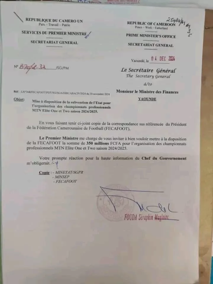 Le championnat a démarré sans que la Fédération n’entre en possession de ce montant. Entre-temps, des notes ont circulé entre les différentes administrations concernées. La dernière en date est celle du Secrétaire général des services du Premier ministre, Séverin Fouda. Le 4 décembre 2024, il invitait le ministre des Finances, Louis Paul Motaze, sur instruction du Premier ministre, à mettre à la disposition de la Fécafoot la somme de 350 millions de Fcfa. Cet argent, selon l’objet, va servir à l’organisation des championnats professionnels de la saison 2024-2025.